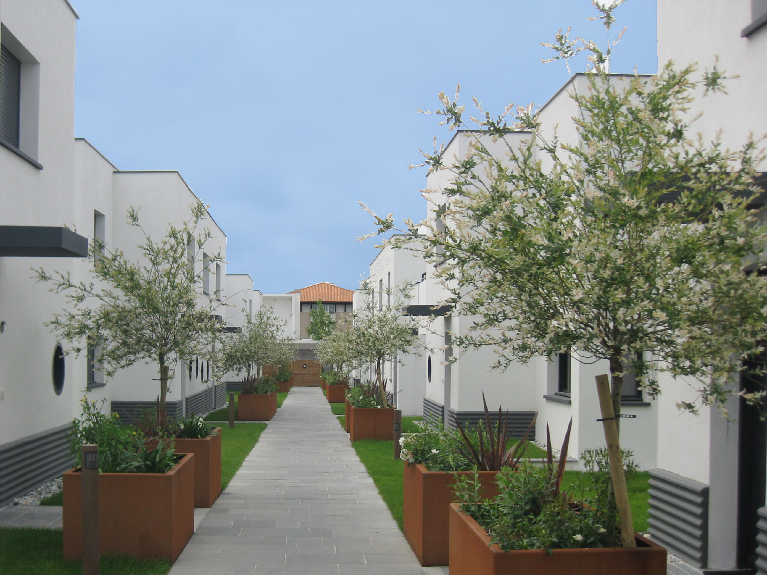Gazon de placage, jardinières en corten sans fond et plantation de saule crevette et d’arbustes variés, goutte à goutte intégré pour la résidence Anadara (promoteur Robert Alday), à Anglet